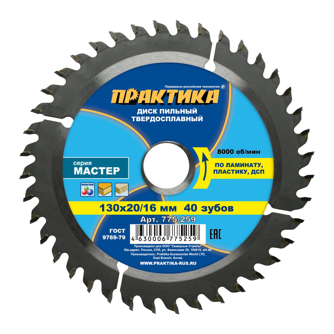 Диск пильный твёрдосплавный ПРАКТИКА 775-259 диаметр наружный 130 мм, диаметр посадочный 20/16 мм. Данный пильный диск делает точный и качественный пропил, обеспечивает чистое пиление и чёткие кромки. Используется с циркуляционными пилами. Количество зубов (лопастей) 40, толщина диска 1,8 мм.