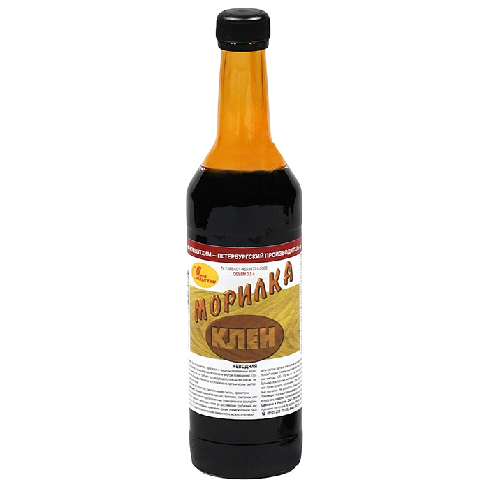 Морилка неводная предназначена для тонирования, пропитки и защиты деревянных изделий, эксплуатирующихся в атмосферных условиях и внутри помещений. Покрытие хорошо полируется, не требует обязательного покрытия лаком, однако для придания глянца сверху на слой морилки можно нанести лак ХВ-784, лак "Цапон" или Яхтный лак "Главный технолог" производства "Новбытхим". Морилка не вызывает набухания древесины. Она изготовлена на основе органических растворителей и не смывается водой.