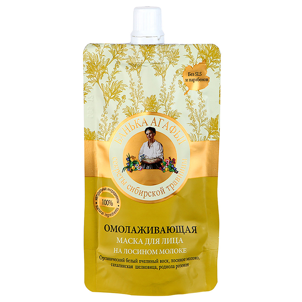 Маска для лица БАНЬКА АГАФЬИ Омолаживающая на лосином молоке содержит 100% натуральные ингредиенты. Нежная маска для лица на питательном лосином молоке в сочетании с сибирскими травами специально создана для омоложения кожи. Щедро увлажняет, стимулирует обновление клеток, повышает эластичность кожи и выравнивает цвет лица. Лосиное молоко в 4 раза питательнее коровьего молока, обладает мощным омолаживающим действием. Родиола розовая богата органическими кислотами и флавоноидами, благодаря чему возвращает коже упругость и эластичность. Сахалинская шелковица содержит каротин, витамины группы В, которые разглаживают и успокаивают кожу. Органический белый пчелиный воск надёжно защищает кожу от обезвоживания.