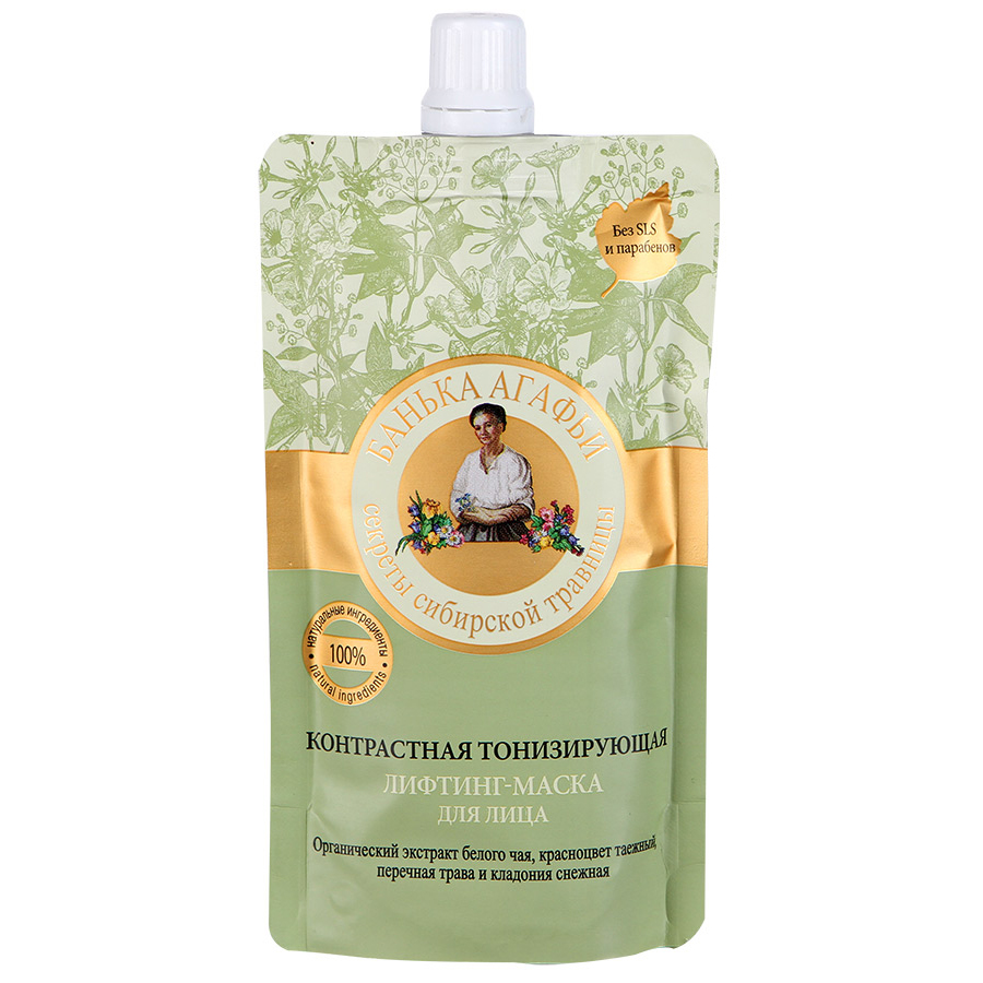 Контрастная маска-лифтинг БАНЬКА АГАФЬИ Тонизирующая содержит 100% натуральные ингредиенты. Маска для лица обладает выраженным лифтинг-эффектом, тонизирует кожу и выравнивает цвет лица. Натуральные компоненты, входящие в состав маски, увлажняют кожу, повышают ее упругость и эластичность. Красноцвет таёжный содержит витамины группы А и С, благодаря чему увлажняет кожу. Органический экстракт белого чая и перечная трава обладают мощным подтягивающим и тонизирующим действиями. Кладония снежная уникальна высоким содержанием усниновой кислоты, что способствует активному обновлению клеток кожи и существенно замедляет возрастные изменения.