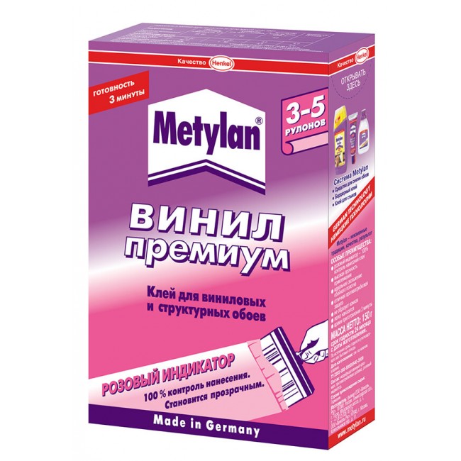 Клей METYLAN Винил Премиум предназначен для виниловых, структурных, рельефных, текстильных и других специальных обоев, шелкографии, а также для всех видов бумажных обоев. Впервые используется цветовой индикатор, позволяющий отслеживать равномерность нанесения клеевого слоя, что дает возможность избежать непроклеенных участков! В процессе высыхания клей становится прозрачным.