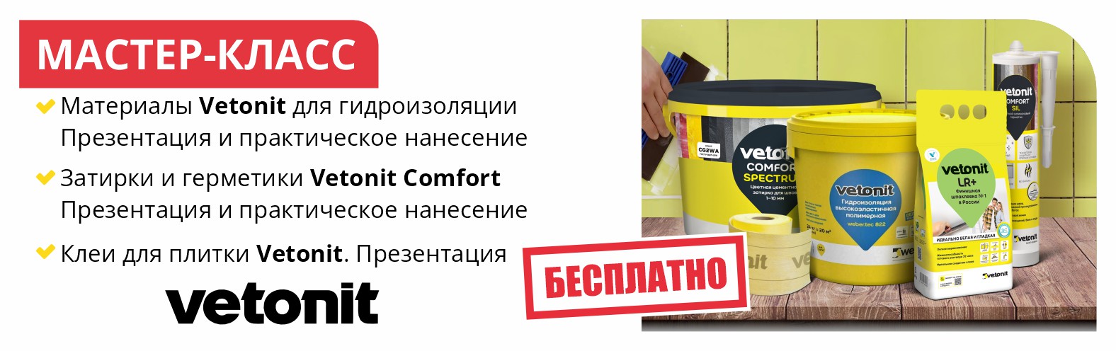 Приглашаем на ​​​​​мастер-класс от Vetonit по гидроизоляции, клеям и затиркам. Практическое нанесение гидроизоляции и ленты, герметики комфорт сил.